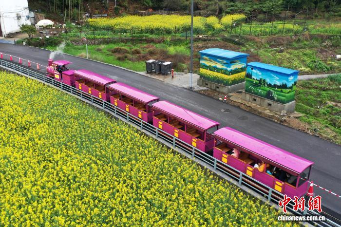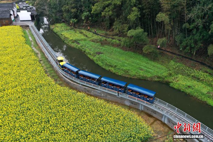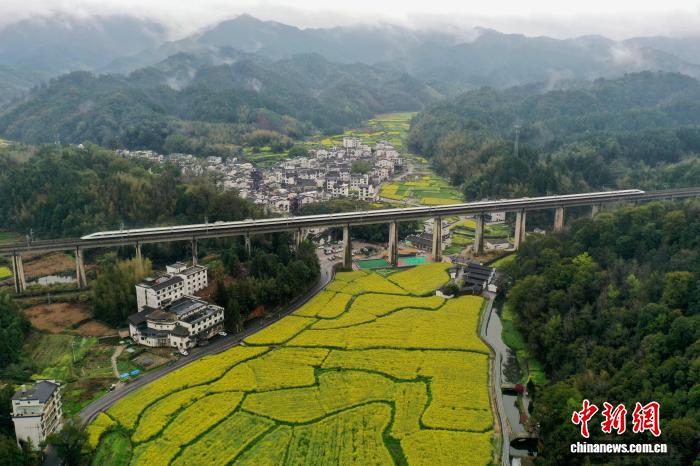 3月24日,1列下铁列车正在江西婺源县李坑古村的油菜花海上圆飞奔而过,古村花海取摩登接通接相照映,演出“启去秋天的列车”。(无人机相片)中新社记者 刘占昆 摄