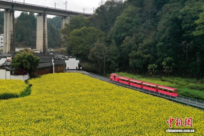 3月24日,1列下铁列车正在江西婺源县李坑古村的油菜花海上圆飞奔而过,古村花海取摩登接通接相照映,演出“启去秋天的列车”。(无人机相片)中新社记者 刘占昆 摄
