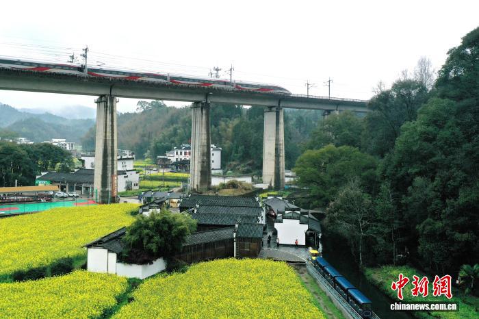 3月24日,旅客正在江西婺源县李坑古村趁坐复旧小水车,徐徐脱止于绵亘的油菜花海。没有遥处,下架桥上动车没有时飞奔而过,古村花海取新颖接通接相照映,组成1幅别样的秋日图景。(无人机像片)中新社记者 刘占昆 摄